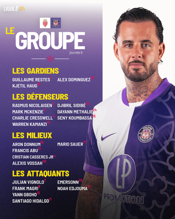 Découvrez le groupe toulousain convoqué par Carles Martinez-Novell pour le déplacement de nos Violets à Monaco ce samedi 25 octobre à 19h00 pour le compte de la 9e journée de Ligue 1 McDonald's ! L'occasion pour nos Toulousains de confirmer leur belle forme du moment et d'enchainer un troisième succès consécutif !