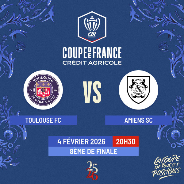 Après 24 heures d'attente, le Toulouse Football Club connait officiellement l'heure et la date de son huitième de finale de Coupe de France face au Amiens SC, pensionnaire de Ligue 2 ! Ce dernier aura lieu au Stadium le mercredi 4 février prochain à 20h30 !