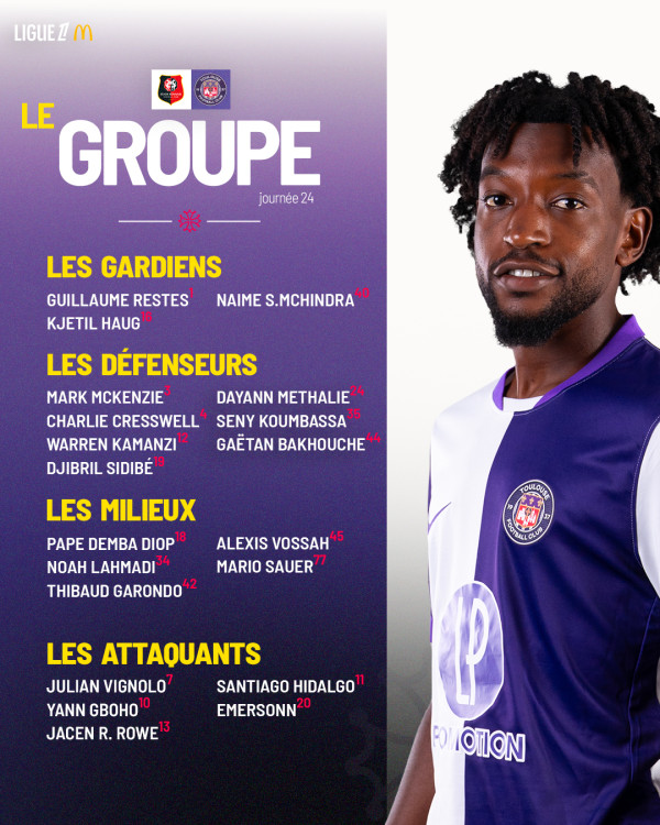 Le groupe toulousain convoqué pour affronter le Stade Rennais, 24ème journée de Ligue 1 McDonald's !
